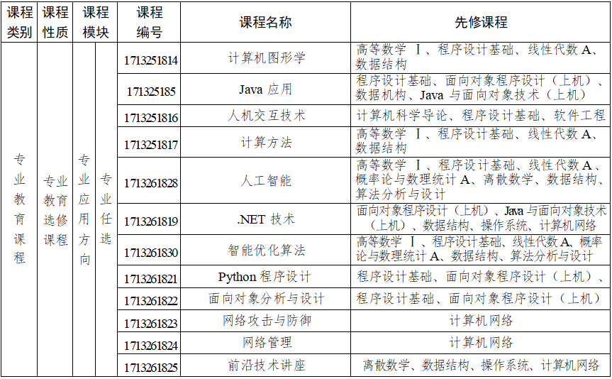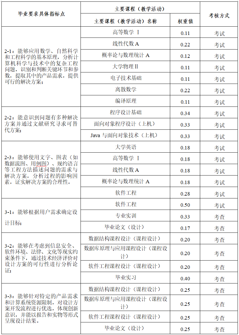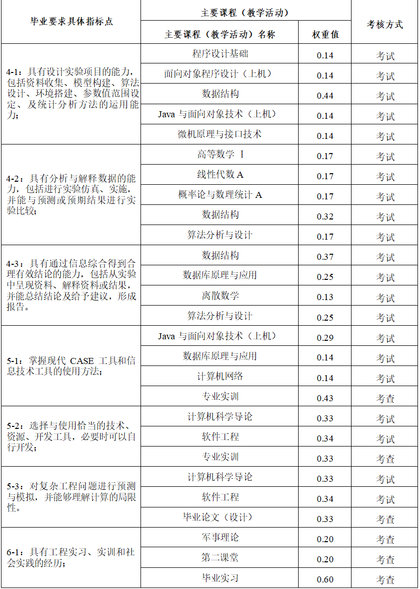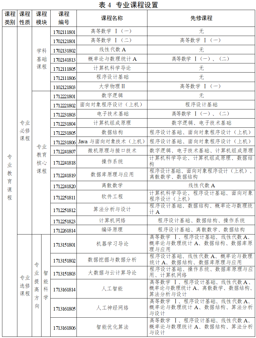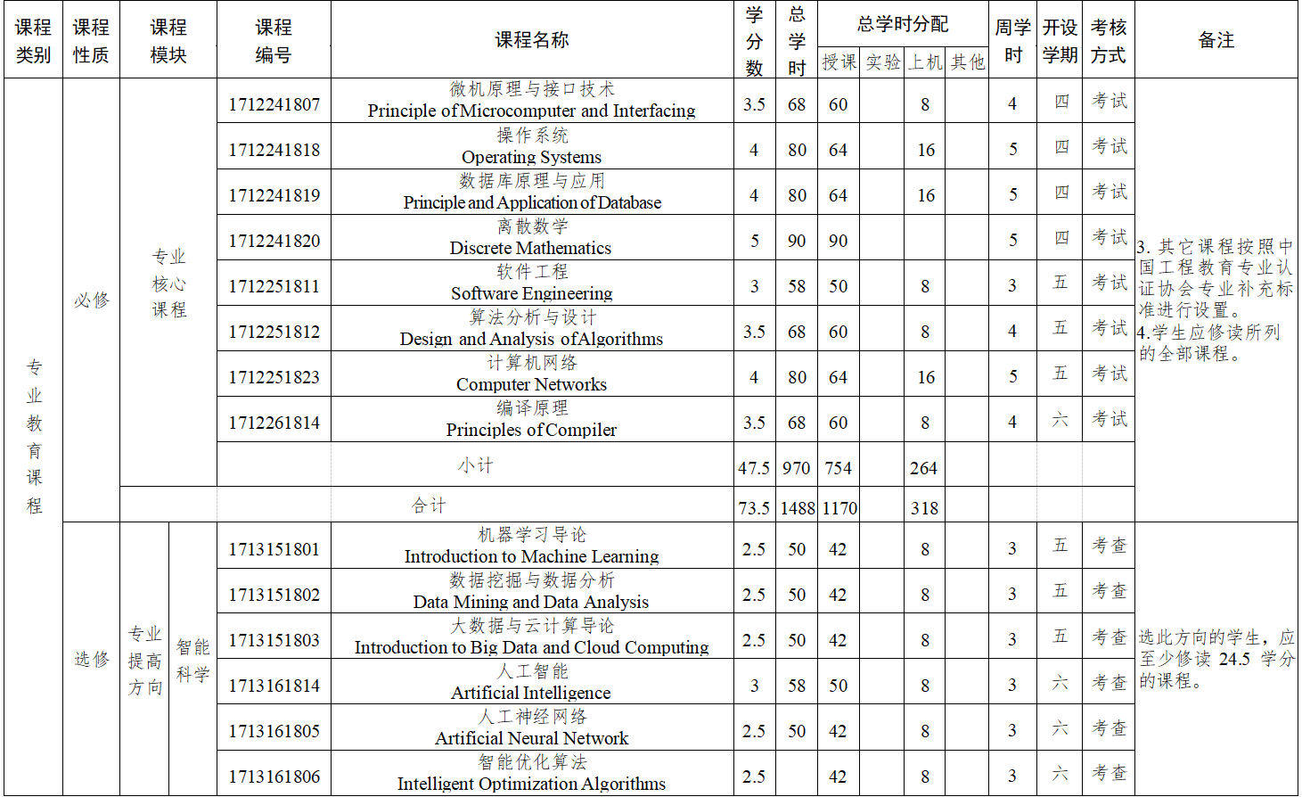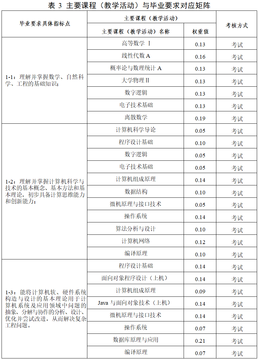 主要课程:高等数学、线性代数、概率论与数理统计、计算机科学导论、程序设计基础、数字逻辑、面向对象程序设计、电子技术基础、计算机组成原理、数据结构、Java 与面向对象技术、微机原理与接口技术、操作系统、离散数学、数据库原理与应用、计算机网络、软件工程、算法分析与设计、编译原理等。