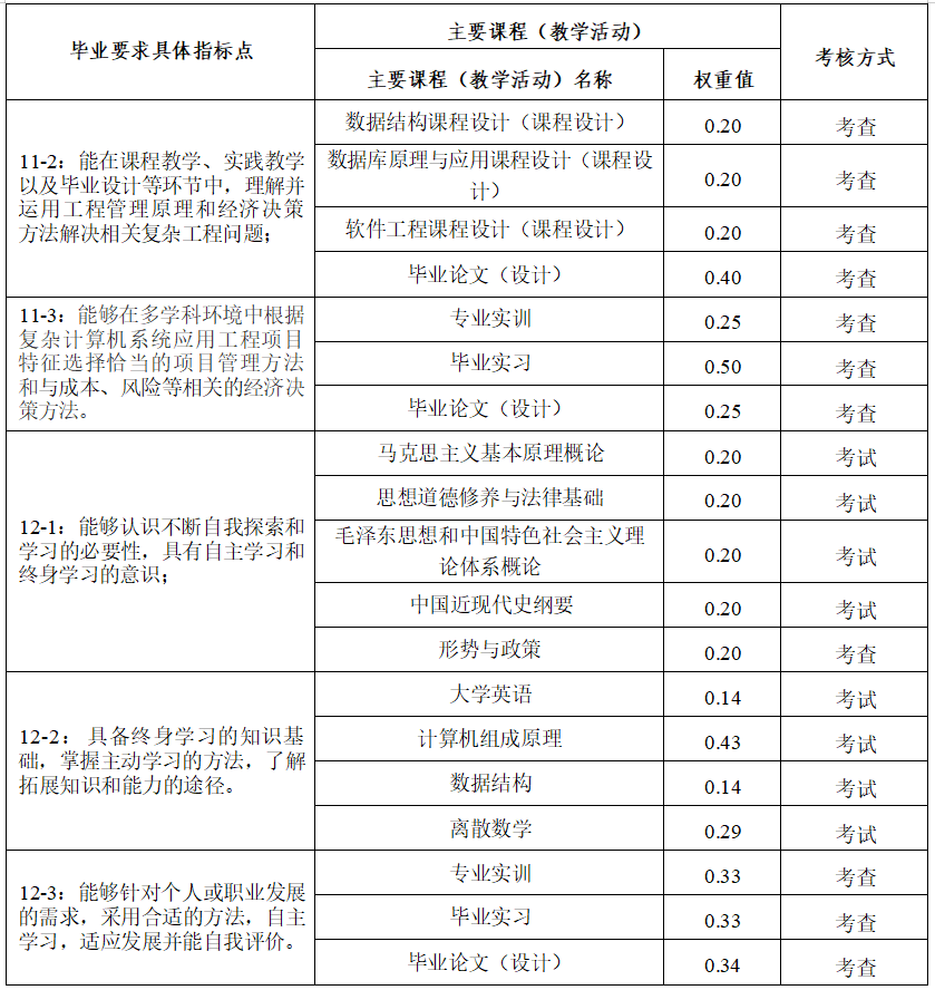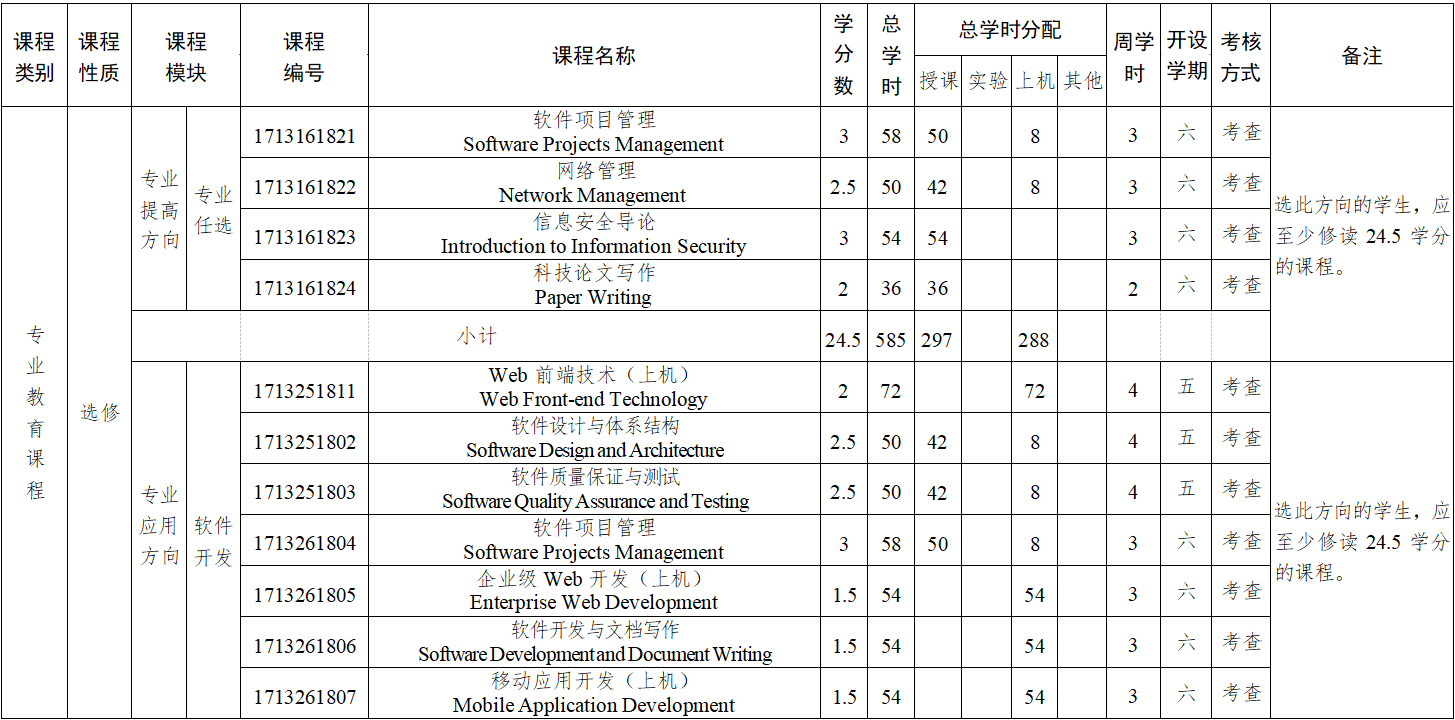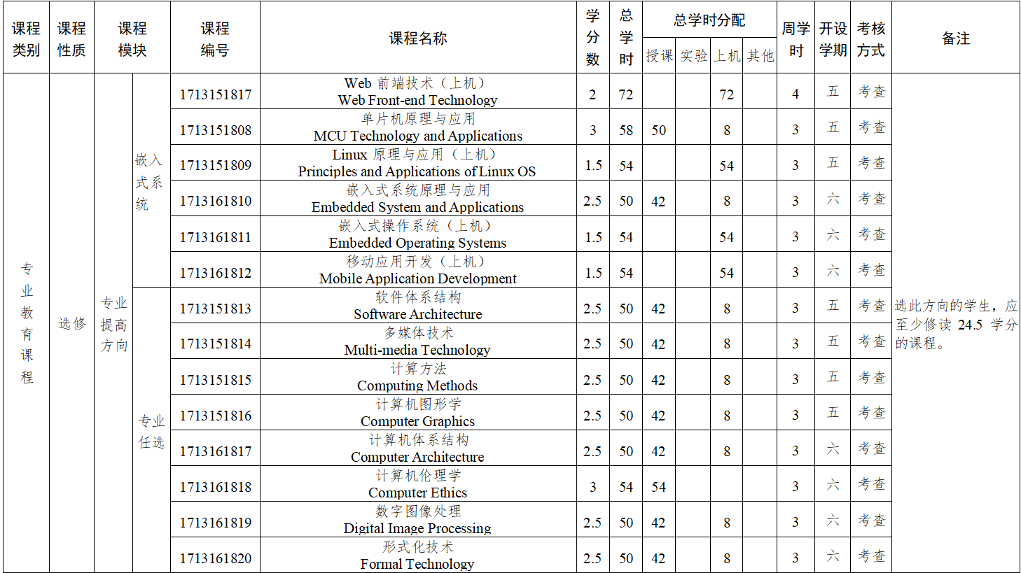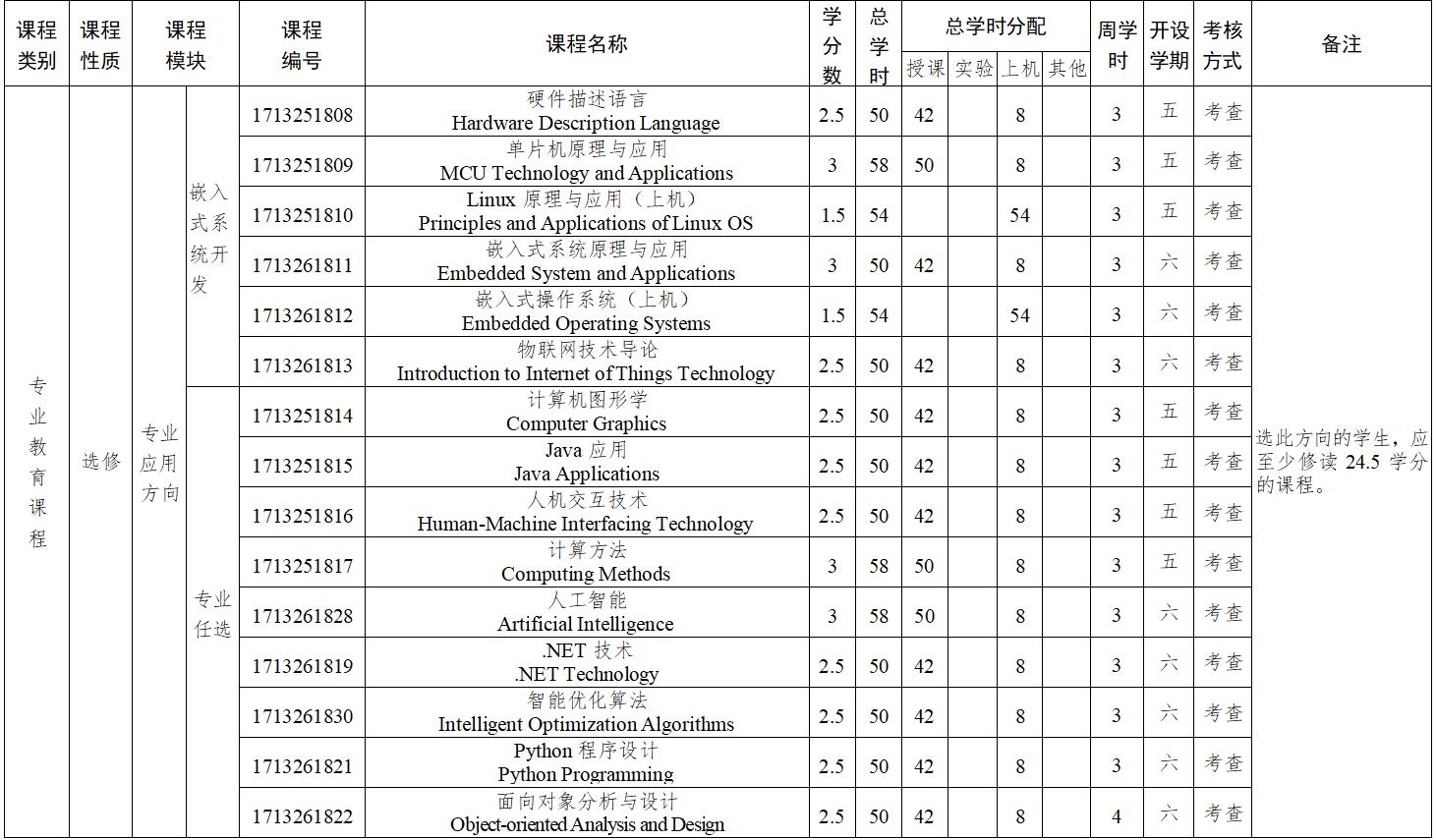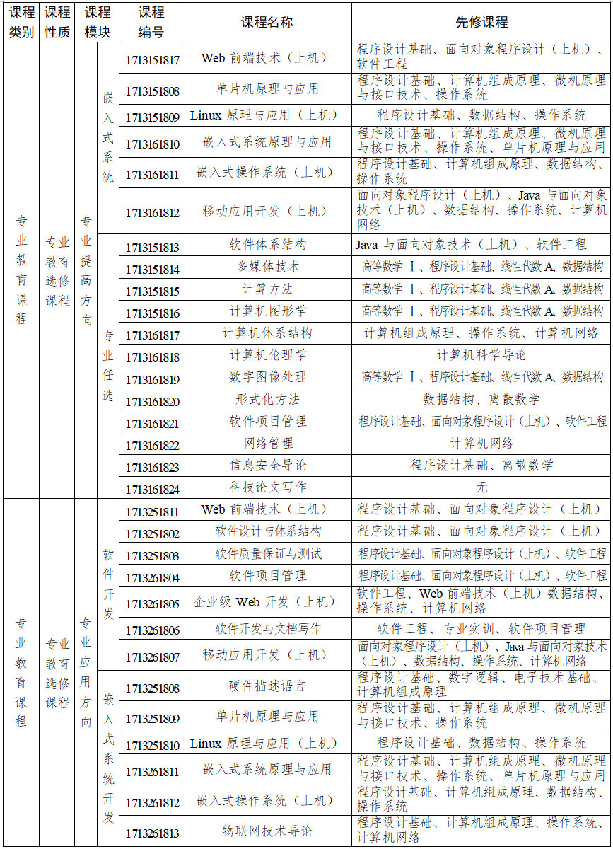 主要课程:高等数学、线性代数、概率论与数理统计、计算机科学导论、程序设计基础、数字逻辑、面向对象程序设计、电子技术基础、计算机组成原理、数据结构、Java 与面向对象技术、微机原理与接口技术、操作系统、离散数学、数据库原理与应用、计算机网络、软件工程、算法分析与设计、编译原理等。