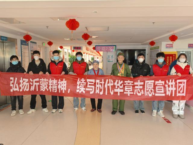1月23日,志愿者来到沂南县天河医院看望抗战老兵、老党员并对他们进行采访。活动伊始,志愿者成员带着关怀与敬佩将牛奶、水果等分发给老人,对他们表达亲切问候。主要采访的有参加过鲁南战役、莱芜战役、孟良崮战役以及淮海战役,并被授予“爆破英雄”光荣称号的朱有芹和老党员李淑元。通过聆听朱有芹和李淑元两位老人讲述参与战役时印象深刻的故事、新中国在他们眼中的发展以及他们对现代青年好好学习、爱国爱党的鼓励,志愿者成员看着老人胸前的奖牌,深受鼓舞,顿生敬佩。最后,朱有芹邀请志愿团一同唱起国歌,李淑元表演沂蒙山小调。在歌声中,志愿者看到了沂蒙人的铮铮铁骨,沂蒙精神的振奋人心以及祖国的繁荣昌盛。志愿者成员纷纷表示,将不负两位老人的殷切期盼,好好学习,把沂蒙精神牢记心中,弘扬沂蒙精神,传承红色文化。