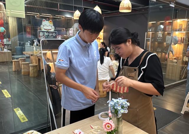 在探访红色足迹后,实践团体验国家级非物质文化遗产。在非遗传承人的细致讲解与示范下,队员们系统了解了黔北地区竹编扇的历史渊源、工艺特点与文化价值,并亲手参与非遗作品的制作。坊内的非遗传承人首先为实践队员讲解竹编的历史渊源,并演示竹扇制作方法,将竹扇制作分为四步,首先将竹编以特定宽度固定,接着以“压二挑二”方法将竹编编绘成扇,随后以自己选定图案剪绘,最后将扇柄插入扇面,制成竹编扇。在传承人的悉心指导下,队员们着手实践,手指穿梭于细密篾丝之间。过程中,队员们曾因施力不均导致篾丝断裂,亦因编织顺序失误需拆解重编,但通过持续试错与调整,最终逐步完成手中竹编扇的制作。从构图描摹到材料处理,青年学子在沉浸式体验中不仅锻炼了观察力、创造力和耐心,更深刻感受到非遗背后所承载的地域智慧与民族情感。