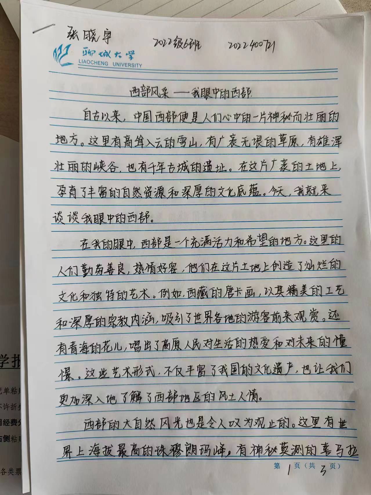 为引导大学生增进对西部地区文化特色和发展现状的理解和认知,鼓励大学生通过文学艺术的方式关注西部地区的社会问题和发展挑战,提高社会责任感和参与意识,积极参与到西部地区社会公益活动、经济建设发展中去,太阳成城集团tyc234cc于4月28日在10号教学楼C308开展了“西部风采—我眼中的西部”征文活动。