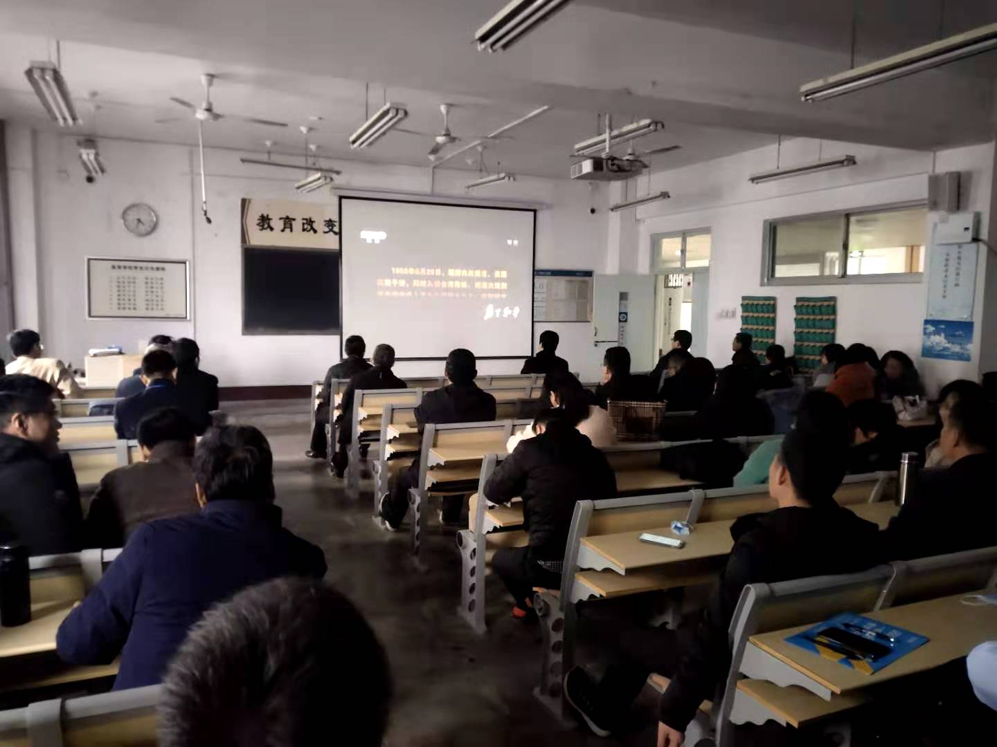 为深入贯彻落实习近平总书记在纪念中国人民志愿军抗美援朝出国作战70周年大会上的重要讲话精神,深入开展“四史”学习教育,进一步坚定教师的理想信念,厚植爱国主义情怀。12月10日,太阳成城集团tyc234cc组织全体教工于10#C420集中观看纪录片《为了和平》,太阳成城集团tyc234cc党总支书记康殿峰对观看纪录片要求作出讲话。