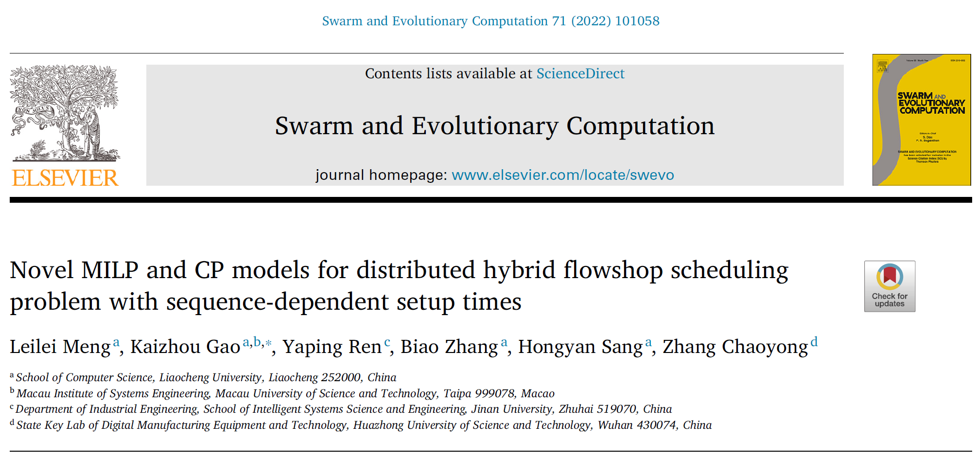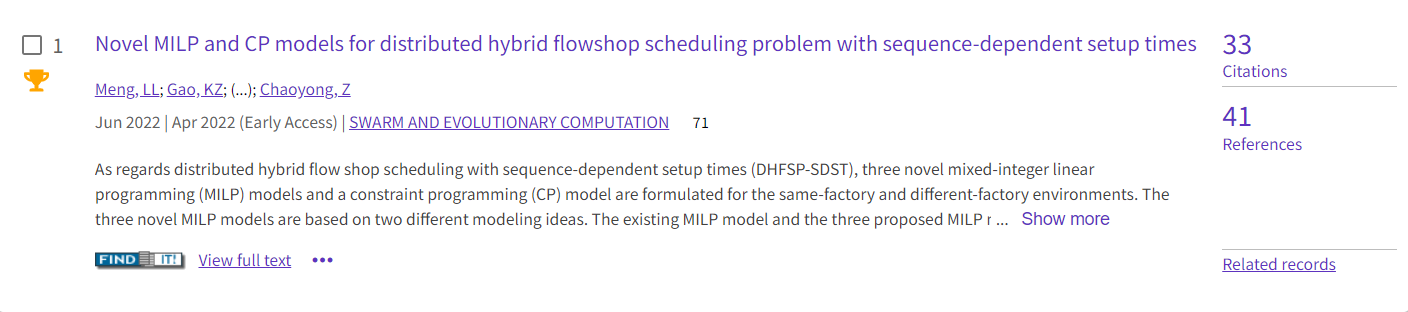 随着经济全球化经济不断发展,制造业也逐步全球化,制造企业正面临前所未有的竞争。在此背景下,为了提高企业竞争能力,需要从传统单一工厂生产模式向多工厂生产模式进行转换。企业可以综合利用分布在不同地方的工厂,从而提高生产效率、提高生产稳定性、降低成本、提高企业竞争力。近年来,随着云计算、物联网、大数据等新兴技术的快速发展,云智造逐步兴起。在云智造背景下,分布在不同地方的工厂将自身的生产情况、订单情况等挂在云端,有助于需求企业选择相应的工厂,将进一步促进分布式制造的发展。分布式混合流水车间调度问题是分布式调度问题中比较复杂的一种,针对其最小化最大完工时间目标的求解是一类NP-Hard问题,极具挑战性。孟磊磊博士等针对该问题提出了三种混合整数规划模型和一种约束规划模型,刷新了该问题多个benchmark实例的当前最好解,研究成果“Novel MILP and CP Models for Distributed Hybrid Flowshop Scheduling Problem with Sequence-Dependent Setup Times,Swarm and Evolutionary Computation,2022,71: 101058”发表于国际知名期刊《Swarm and Evolutionary Computation》(中科院1区Top,影响因子为10),入选2023年9月ESI高被引论文,并于近日被全球工程领域著名机构Advances in Engineering(AIE)遴选为关键科学文章进行专题报道。