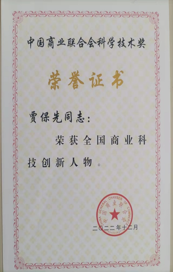 太阳成城集团tyc234cc团队完成的一项成果获全国商业科技进步奖三等奖,团队成员贾保先荣获中国商业联合会“全国商业科技创新人物”荣誉称号。