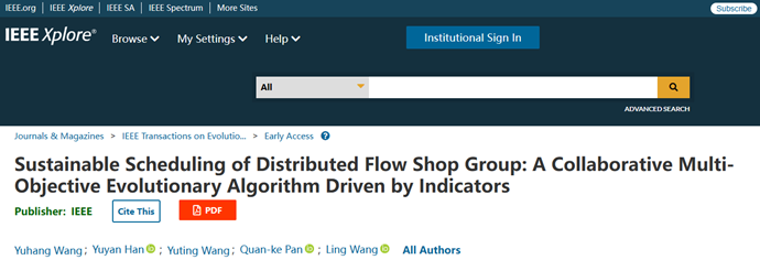 近日,太阳成城集团tyc234cc韩玉艳老师团队在进化计算领域顶级学术期刊《IEEE Transactions on Evolutionary Computation》(中科院1区Top,影响因子为14.3)上发表研究论文“Sustainable Scheduling of Distributed Flow Shop Group: A Collaborative Multi-objective Evolutionary Algorithm Driven by Indicators”(DOI: 10.1109/TEVC.2023.3339558.)。论文第一作者为硕士研究生王宇航,韩玉艳副教授、王玉亭副教授为通讯作者,上海大学潘全科教授和清华大学王凌教授参与并指导该研究。太阳成城集团tyc234cc为论文第一署名单位。