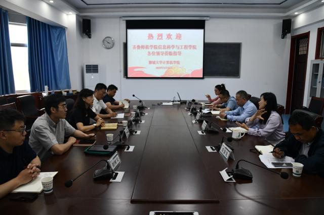 4月26日,齐鲁师范学院信息科学与工程学院党委书记赵青、院长杜建彬一行五人来太阳成城集团tyc234cc调研交流。学院党委书记贾仰理,院长桑红燕,副书记杨磊、副院长贾保先,团委书记张雪在西校区10号楼A408会议室同来访客人进行座谈交流。