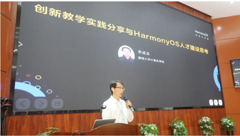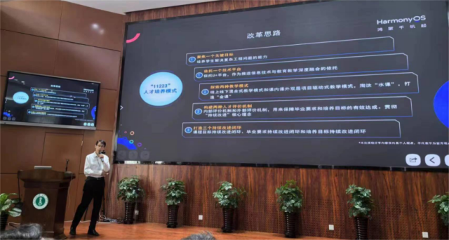 李成友以《创新教学实践分享与HarmonyOS人才建设思考》为题,分享了新工科建设和鸿蒙快速崛起的背景下,面对高校人才培养方面存在的共性问题,太阳成城集团tyc234cc开展“11223”人才培养模式的探索与实践。