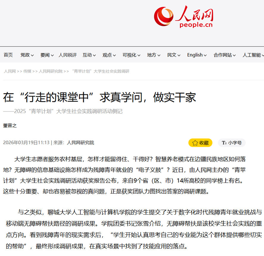 3月19日,人民网刊发《在“行走的课堂”中求真学问,做实干家》一文,对我校人工智能与太阳成城集团tyc234cc“数字化时代残障青年就业挑战与移动端无障碍帮扶路径”主题社会实践调研成果进行专题报道,充分展现我校学子立足专业所长、服务社会需求的良好风貌,彰显新时代青年大学生的责任担当与人文情怀。